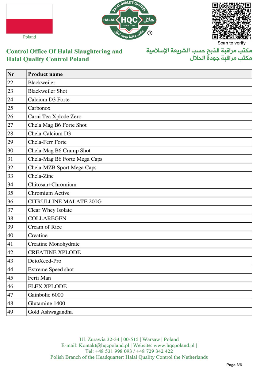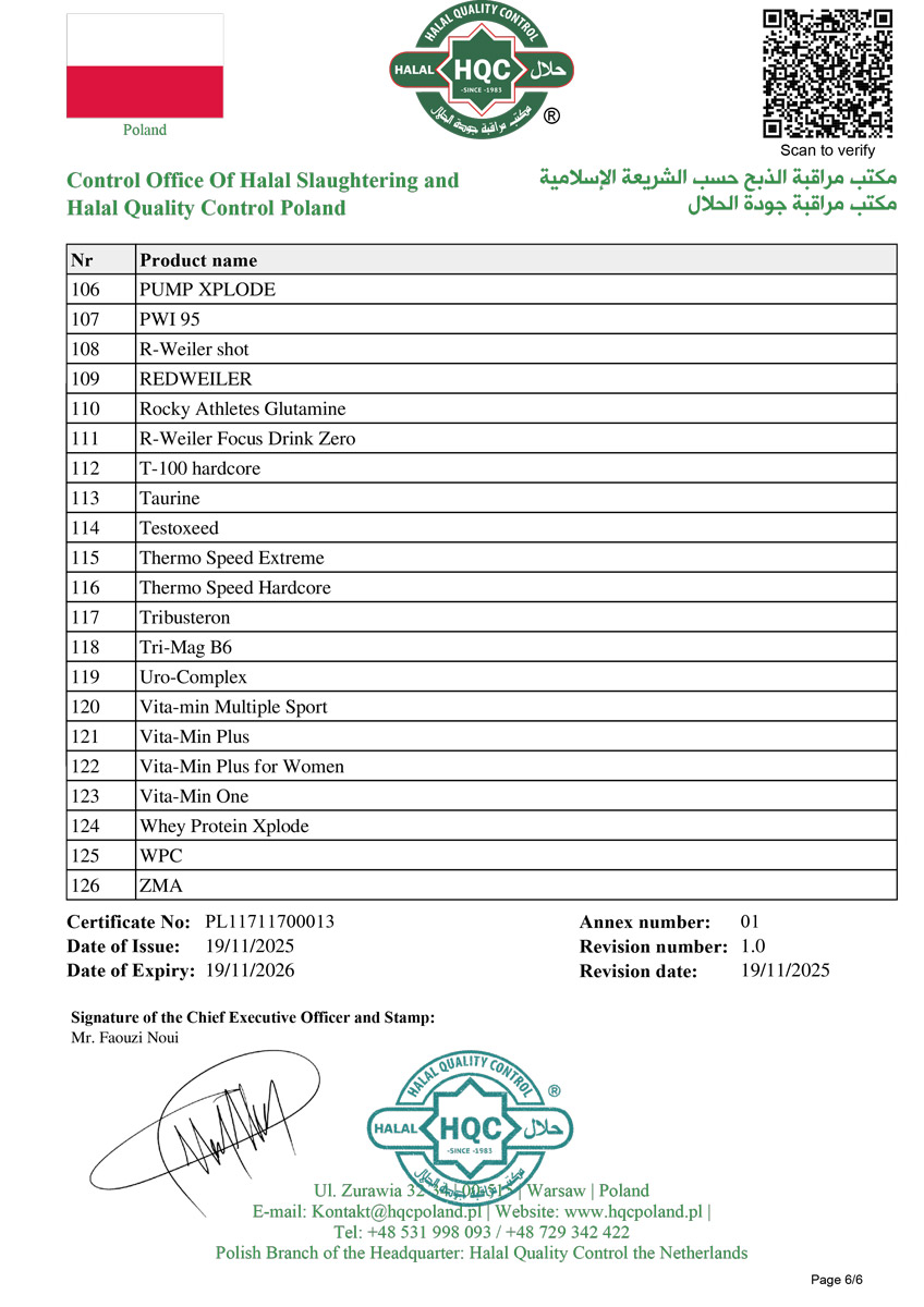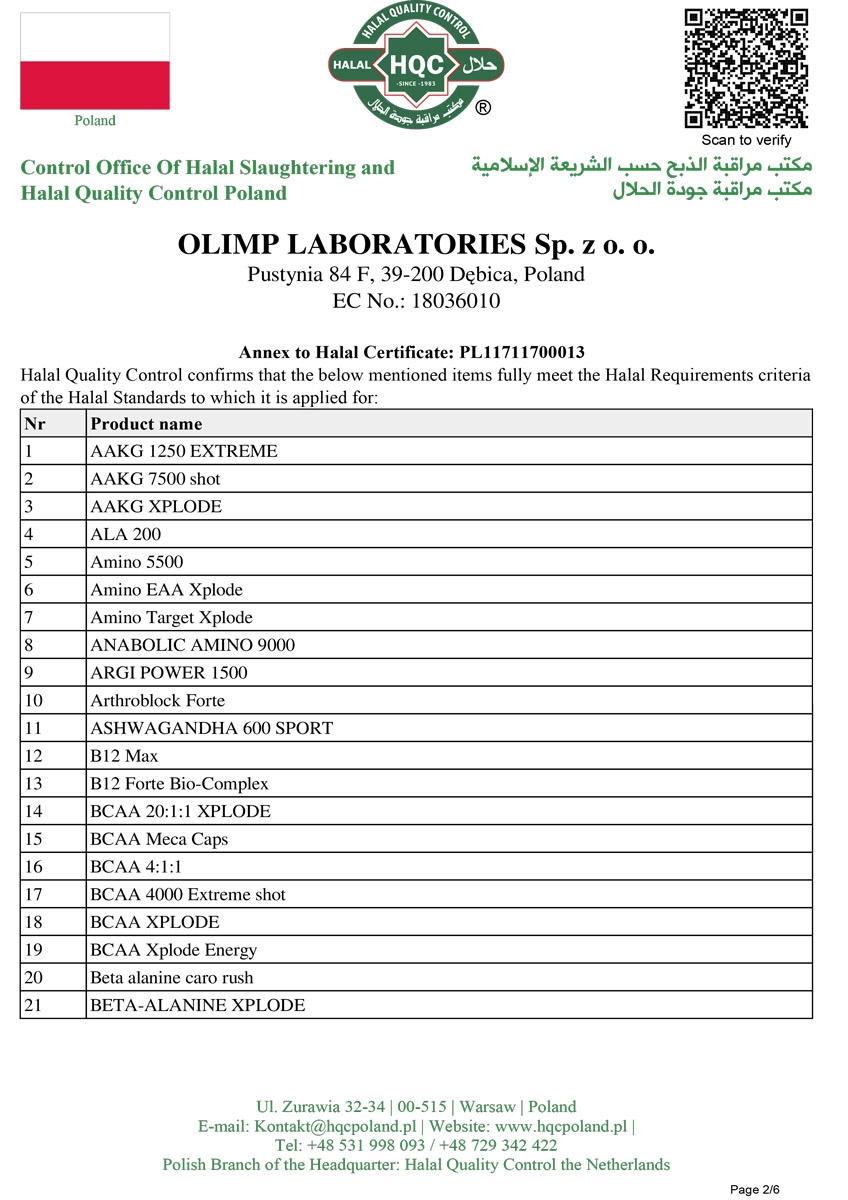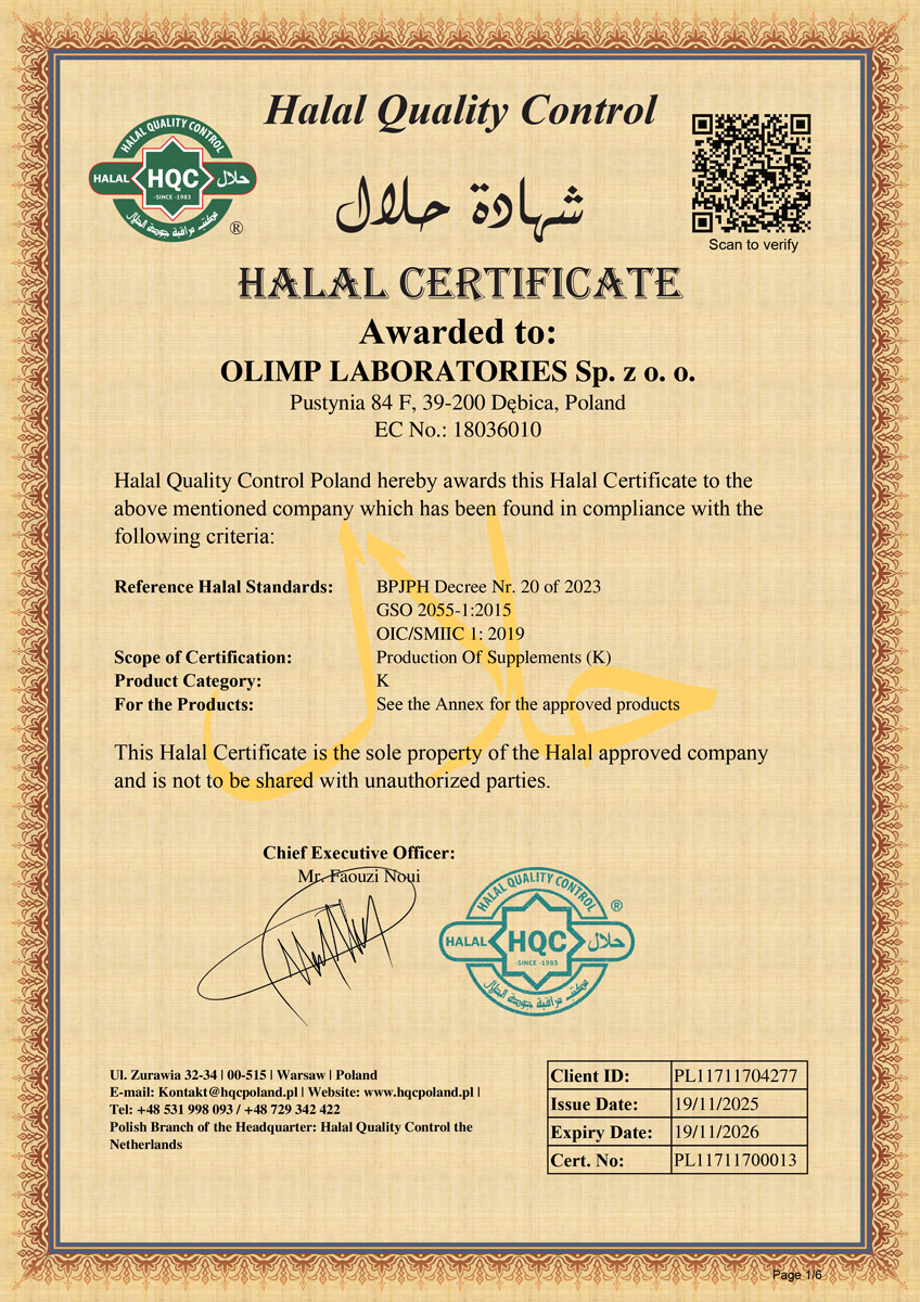 Les certifications confirment que la marque Olimp Sport Nutrition respecte des normes de qualité élevées et répond aux exigences du marché des compléments alimentaires et suppléments pour les sportifs.