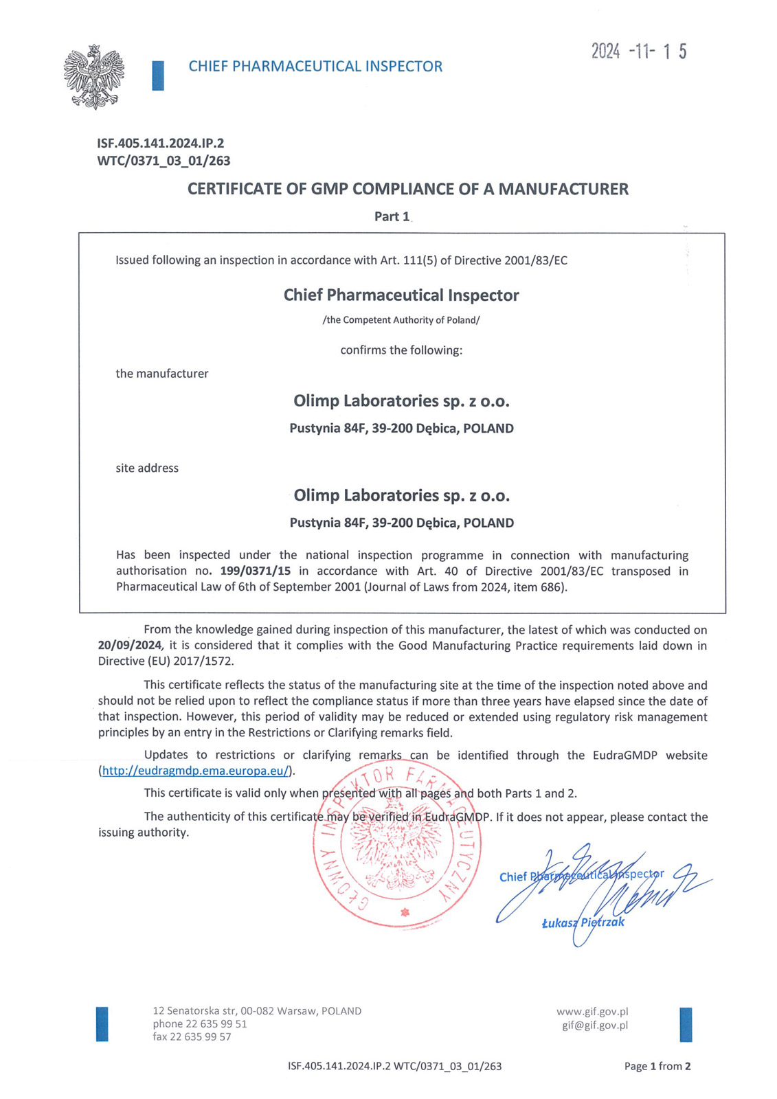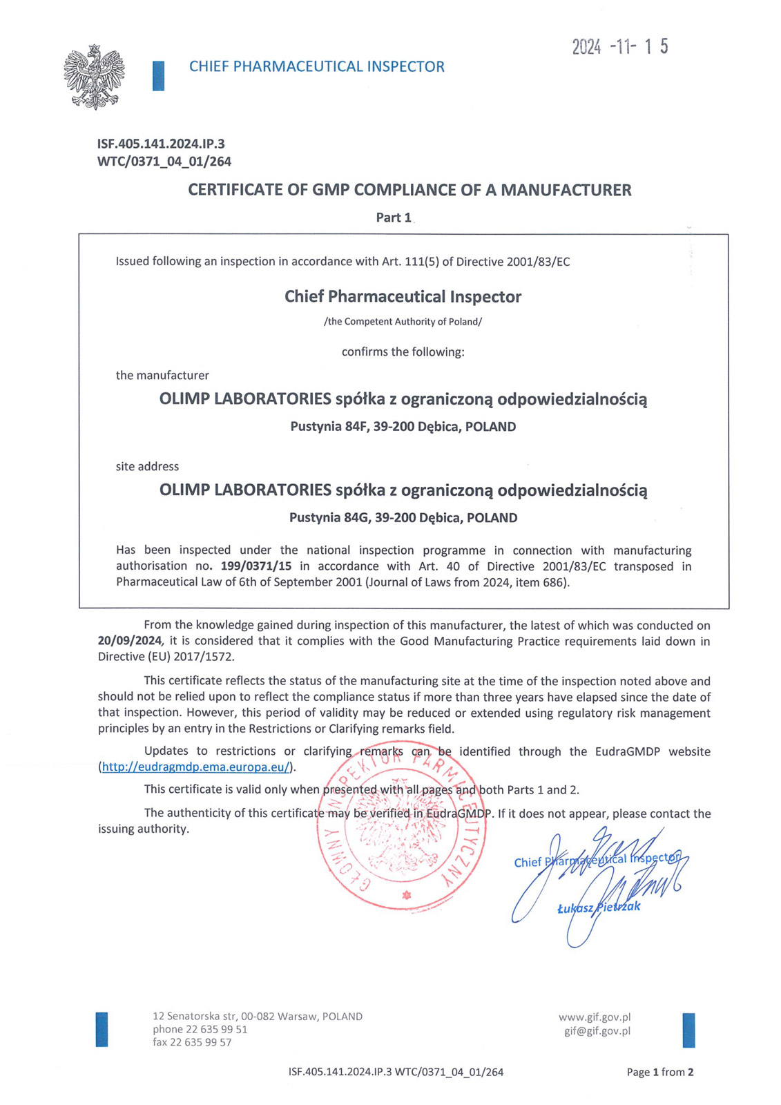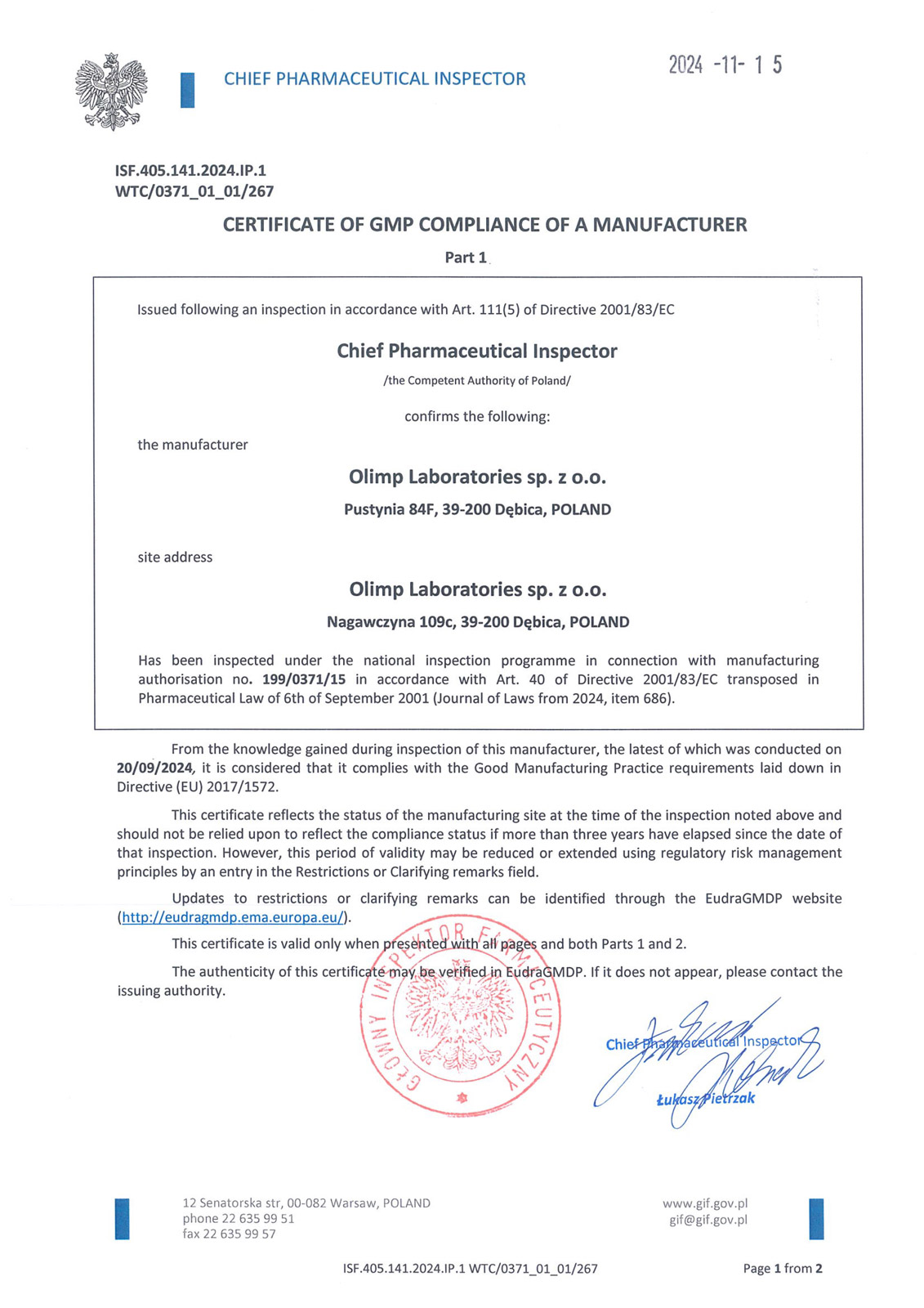 Les certifications confirment que la marque Olimp Sport Nutrition respecte des normes de qualité élevées et répond aux exigences du marché des compléments alimentaires et suppléments pour les sportifs.