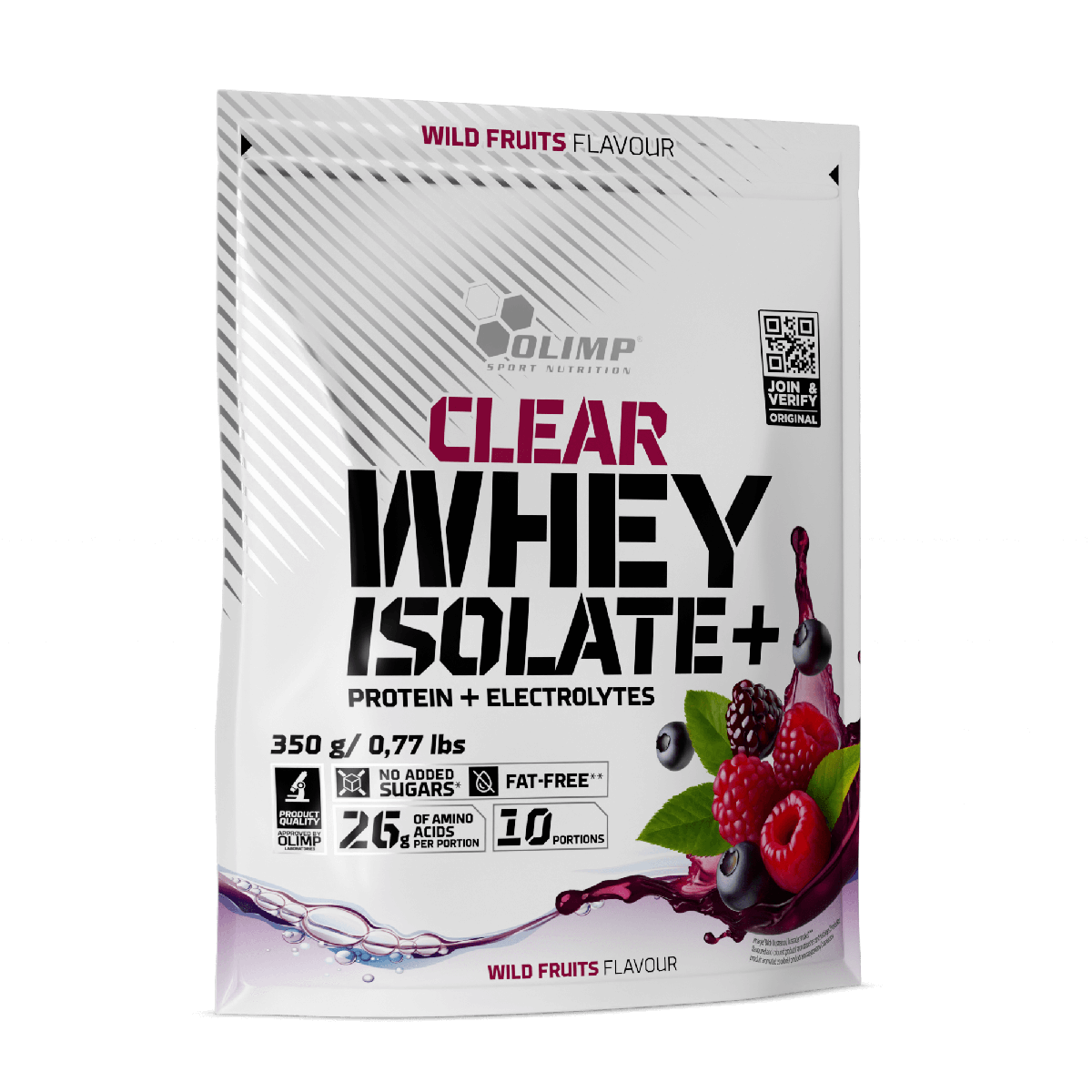 Olimp Clear Whey Isolate+ - Poudre pour la préparation d'une boisson riche en protéines avec des électrolytes. Avec édulcorants. Convient aux végétariens. *Sans sucres ajoutés. Contient des sucres naturellement presents. **Sans matières grasses. Saveur Wild Fruits.